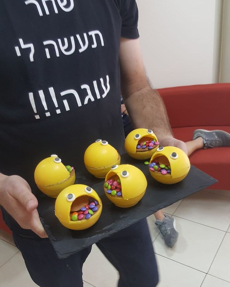 מטמפררים 300 גר שוקולד לבן וצובעים בצהוב. יוצקים שוקולד מטומפרר לתוך תבנית סיליקון שקעים, מוודאים שכל השקע מלא, ואז הופכים את התבנית כדי ששאריות השוקולד ירדו לתוך הקערה בחזרה. מעבירים את התבנית למקום קריר כדי לייצב את השוקולד, לפני שמחלצים אותו מהתבנית. לאחר מכן ניתן ליצור עיניים מבצק שוקולד, או מבצק סוכר ו "להדביק" על הראש.הרכבה