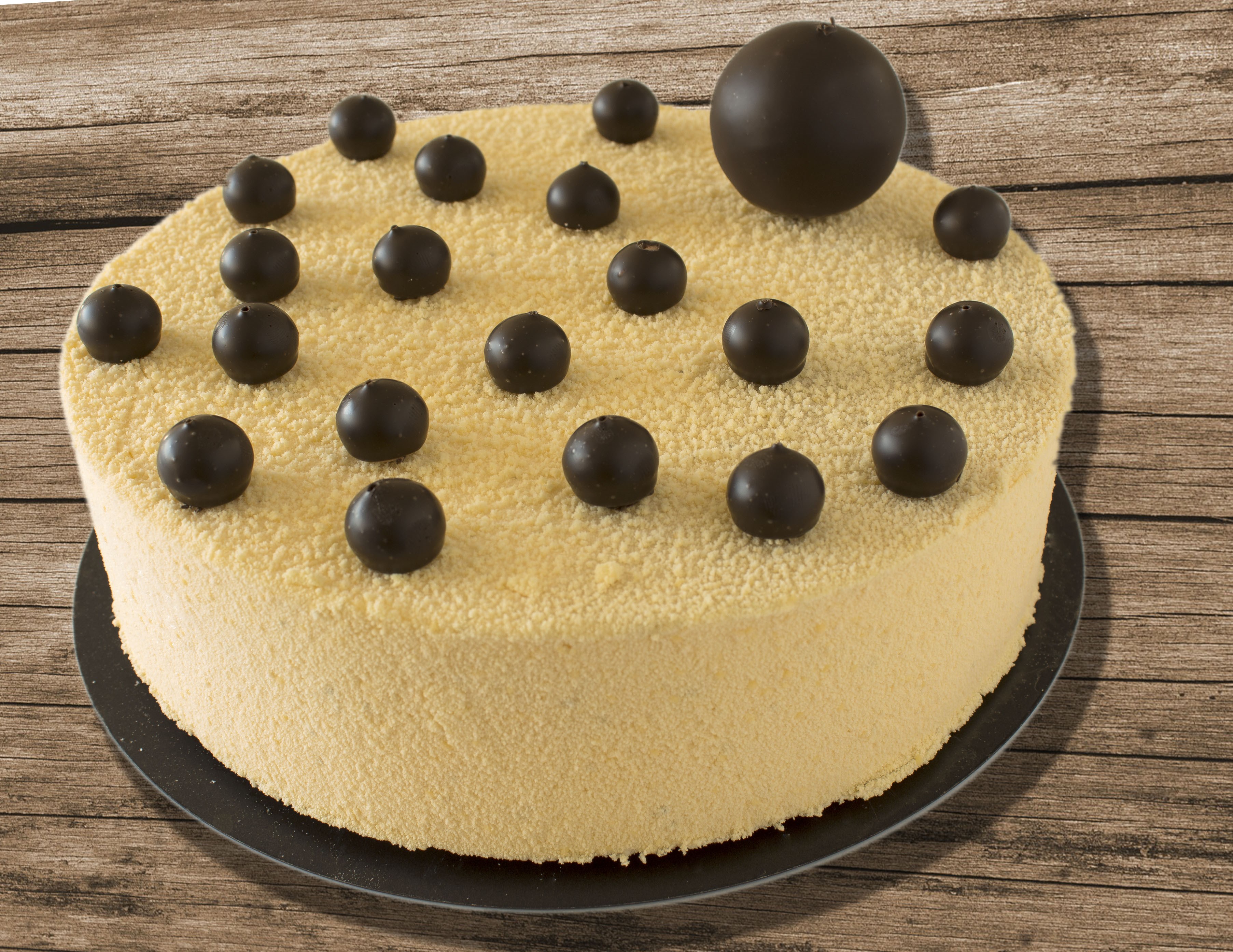 עוגה חגיגית עם מוס פסיפלורה, נמלקה שוקולד לבן, נוגטין אגוזי לוז, ומרנג שוויצרי.(קוטר 22)